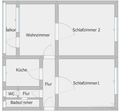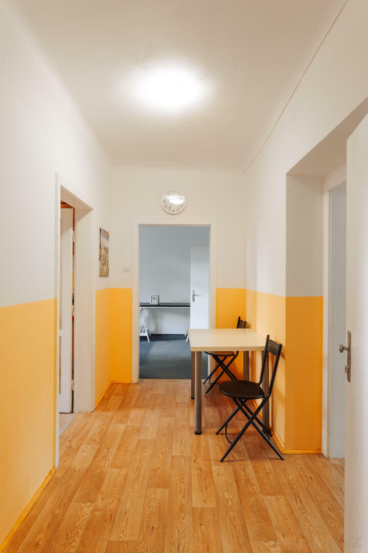 Die Wohnung liegt im ersten Stock (mit Lift). Links vom Vorraum erreicht man das Bad (mit Wanne) und die Küche (mit Abstellkammer), rechts gelangt man in das erste Zimmer und am Ende des Vorraums in das Zimmer mit Balkon. Zwei der drei Zimmer sind über den Vorraum erreichbar, ein Durchgangszimmer (mit französischem Balkon).