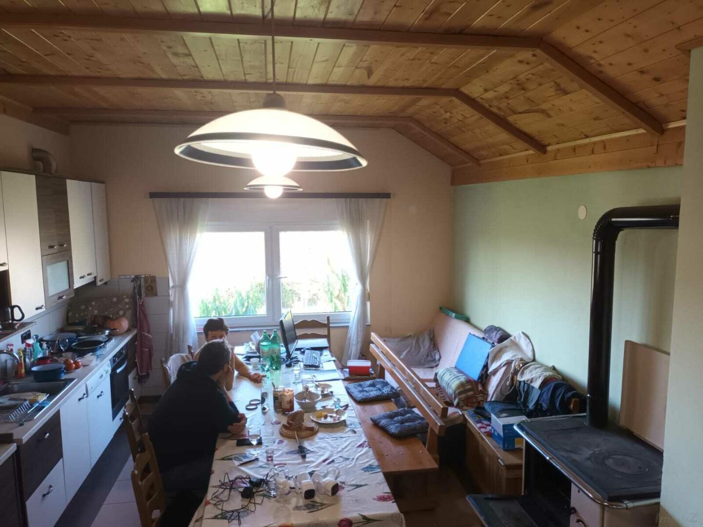 Herd zum Kochen im Esszimmer / Küche, und Kamin mit Wärmekanal im Wohnzimmer.